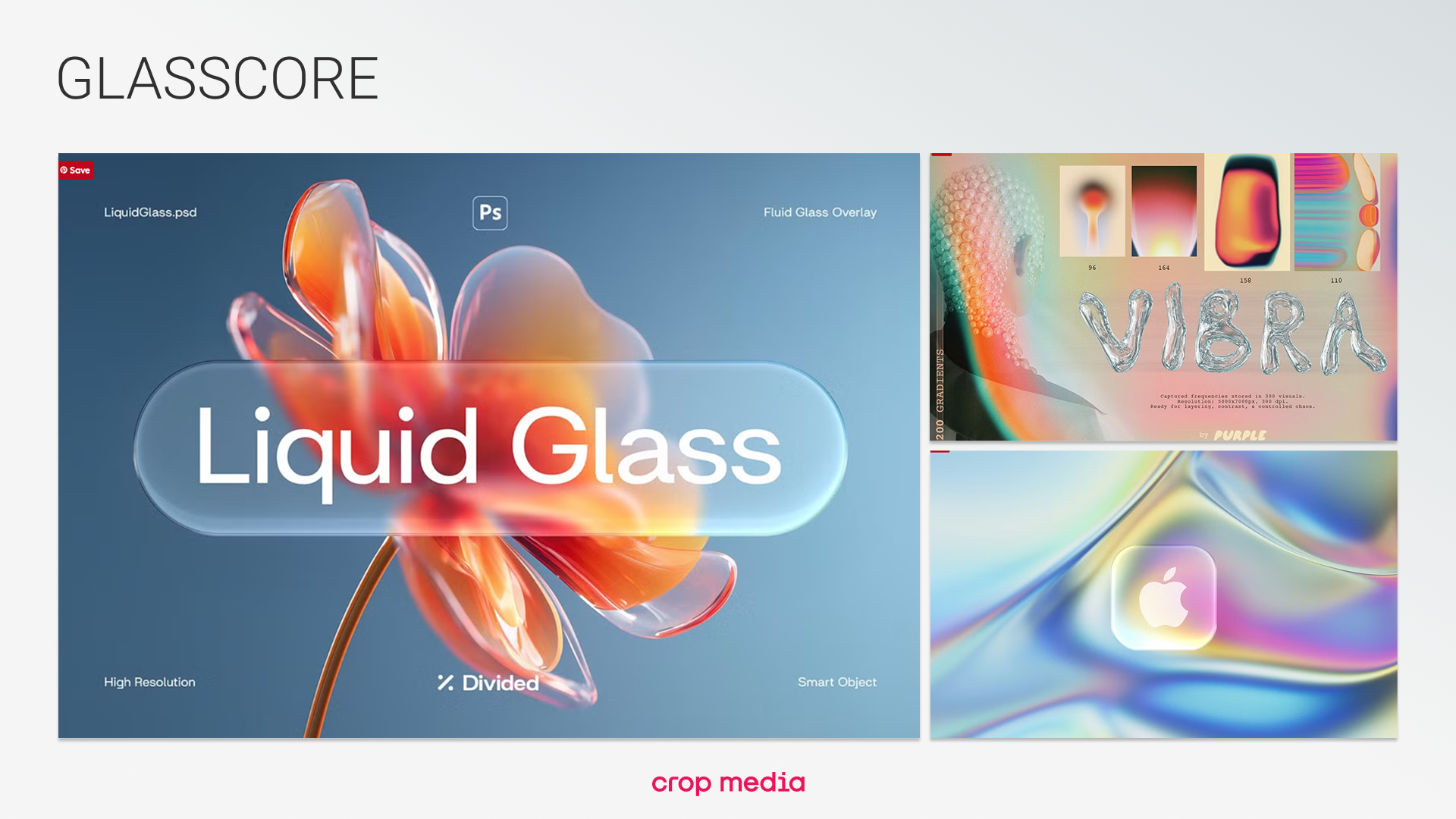 Градиенты, блики, преломления и многослойная прозрачность — имитация стекла, воды и геля.
