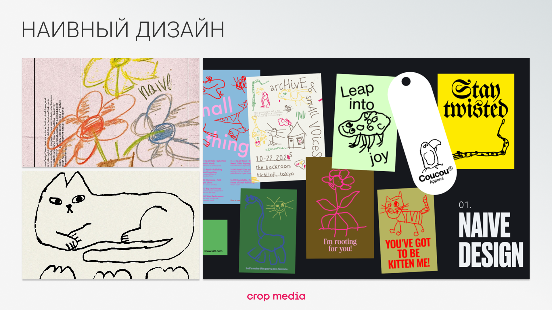 Сознательный отказ от «правильности». По-детски непосредственный и несовершенный. Неровные заливки, шероховатые линии, улыбающиеся солнышки и иллюстрации.