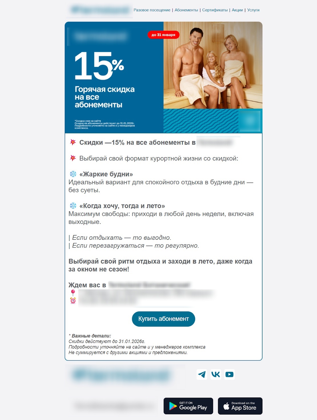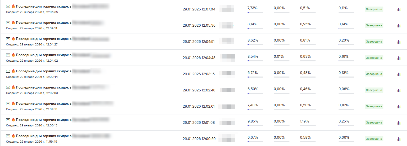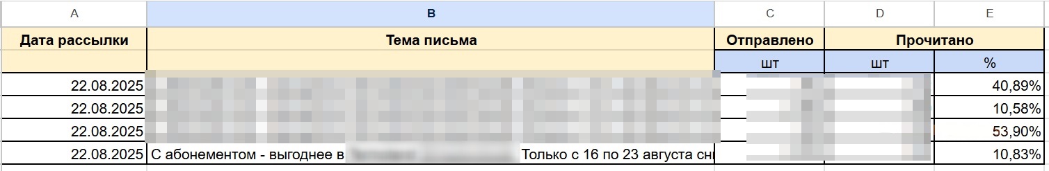 Мы регулярно тестируем темы и заголовки, чтобы повысить открываемость, а также отправляем разные офферы и акции для разных сегментов.