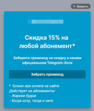 Клиент заходил на сайт и через 10 секунд видел попап с предложением получить промокод на скидку. Получить промокод можно было после перехода в Telegram-бот.