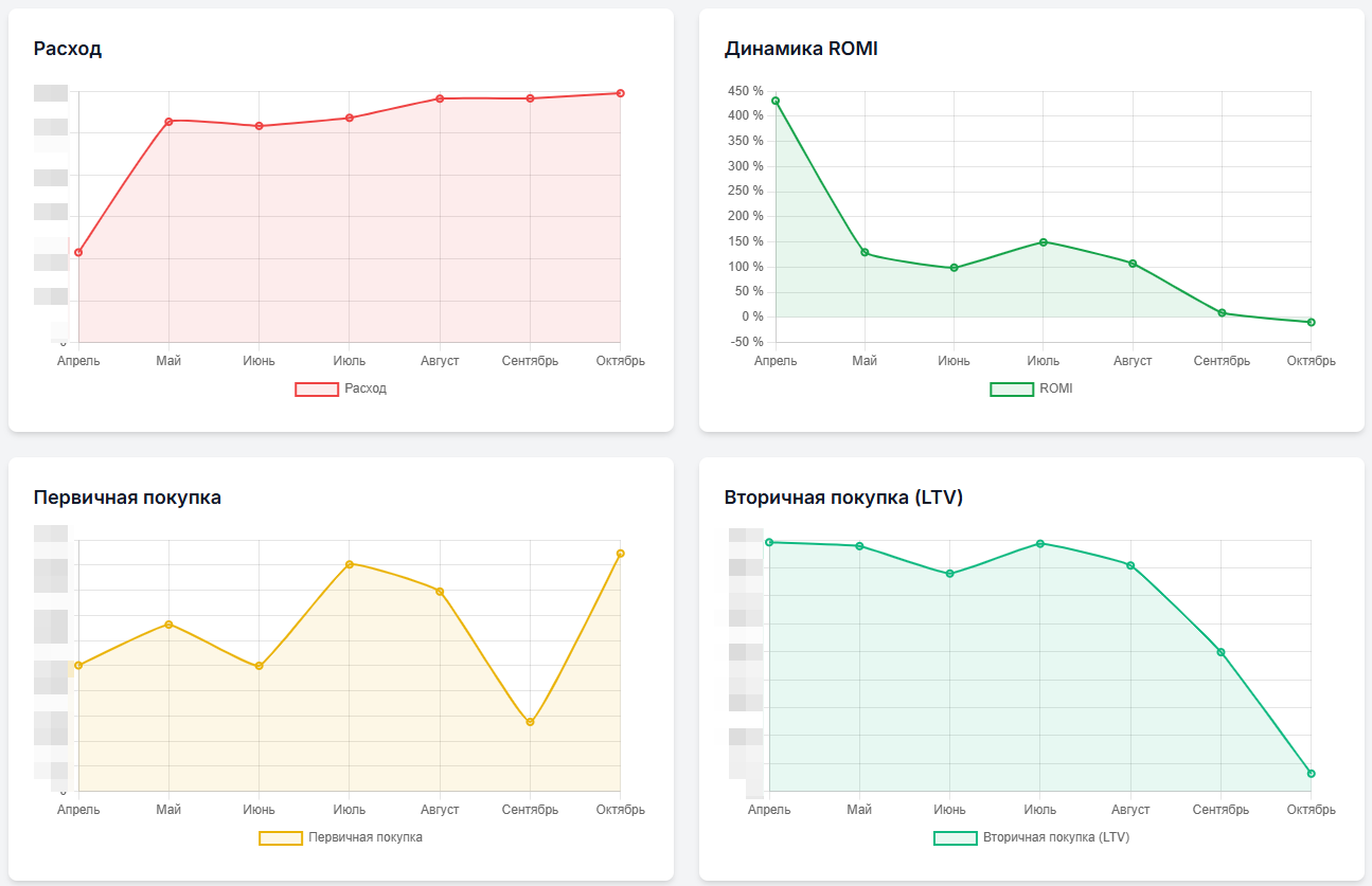 На графике "Вторичная покупка (LTV)" мы видим резкое снижение в сентябре и октябре. Это происходит потому, что клиенты, привлеченные в апреле, имели в распоряжении 100% времени отчетного периода для совершения повторных покупок в офлайне. Клиенты же октября находятся в системе всего несколько дней. Они уже совершили первичную покупку (что видно по росту желтого графика), но физически не успели совершить второй и третий визит, которые формируют основной объем LTV.