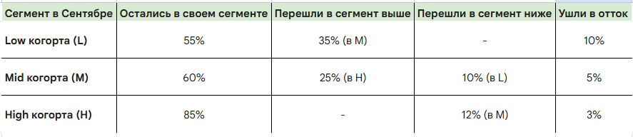 - Контроль перетока клиентов между когортами — переводили клиентов в более ценные когорты за счет индивидуальных предложений.