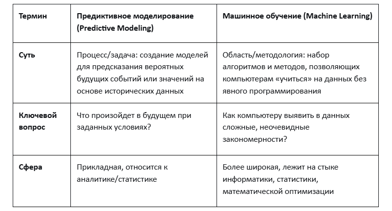 Итак, простыми словами, предиктивное моделирование это цель — прогнозирование будущего. Машинное обучение — это самый мощный и гибкий метод ее достижения.