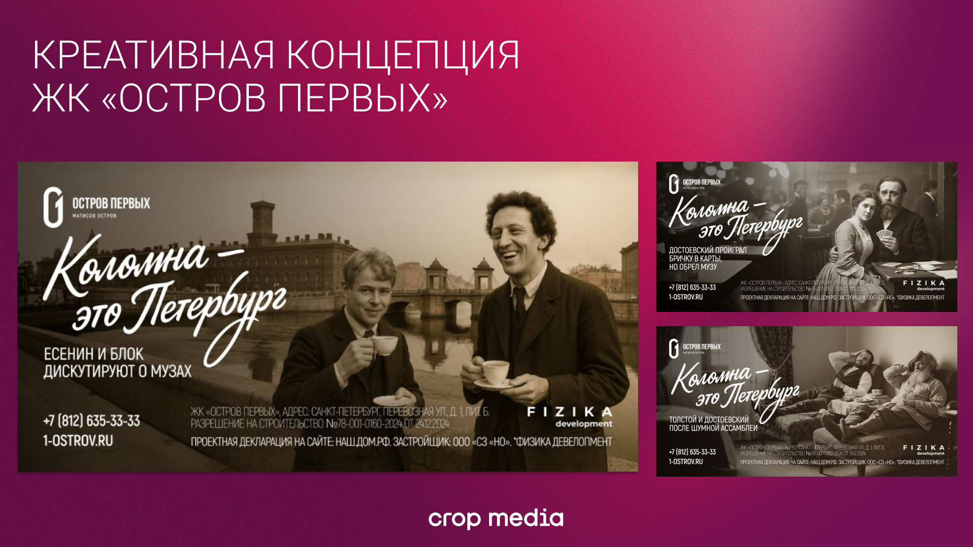 Нашей основной миссией как девелопера мы видим не просто реализацию квартир, но и развитие, популяризацию Петербурга и его центральных основных районов. Как мы поняли после опросов, даже многие петербуржцы не знают, что Коломна — это всё-таки центр Петербурга, а не пригород Москвы. Именно поэтому родилась такая идея, а Crop media превратили её в серию креативов с известными личностями, которые либо проживали, либо творили в этом месте.Николай Соколов, директор по маркетингу Fizika Development