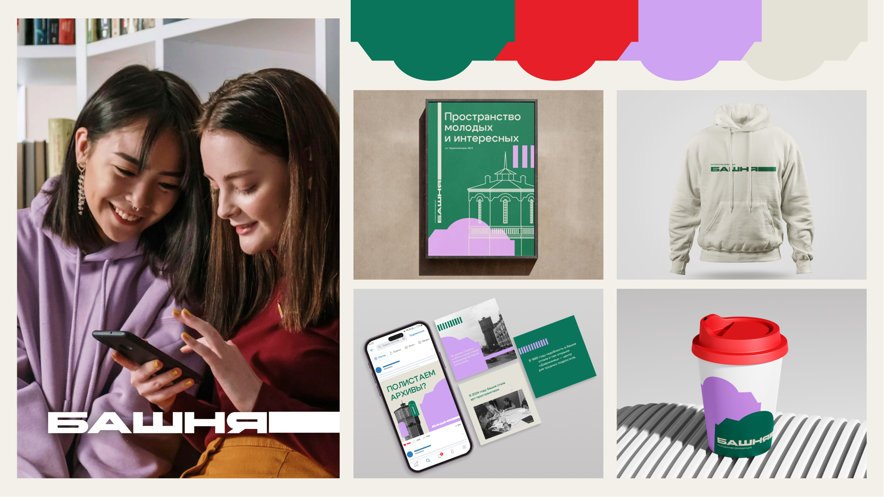 Или другой наш заказчик и архетип — молодежное арт-пространство «Башня». Это явный творец с легкими элементами искателя. Оба проявляются в переосмыслении архитектуры. В старой водонапорной башне мы видим новое: трубы-линии, форму. Используем это везде: от логотипа до постеров.