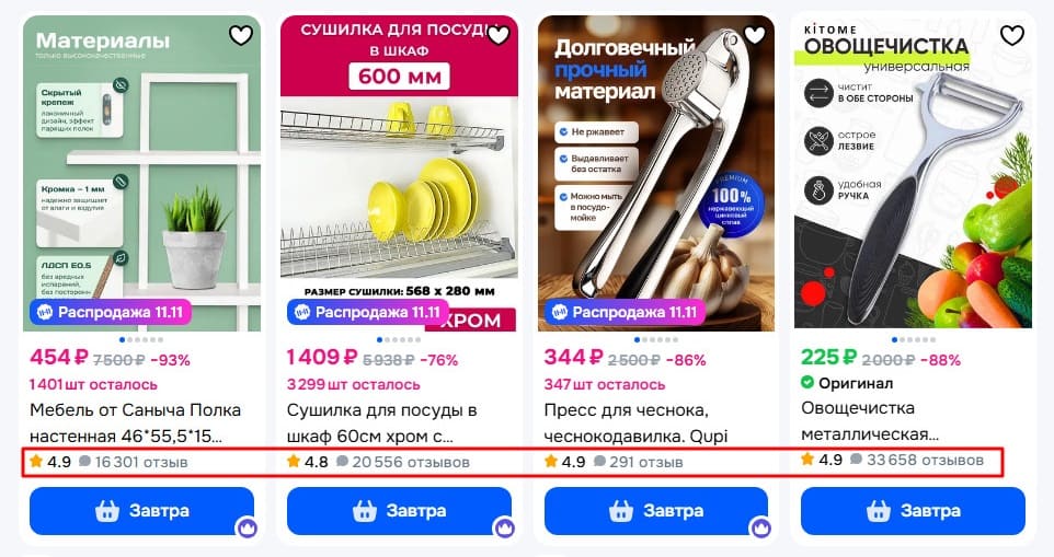 - отзывы, рейтинг. Средняя оценка, которую покупатели поставили товару за весь период. Рейтинг карточки выше 4,5 говорит алгоритму о качестве и соответствии ожиданиям, ниже 4,5 – о наличии проблем. Негативные сигналы влекут за собой пессимизацию и снижение конверсии: при поиске товаров клиенты используют фильтр, чтобы сначала видеть предложения с высоким рейтингом;