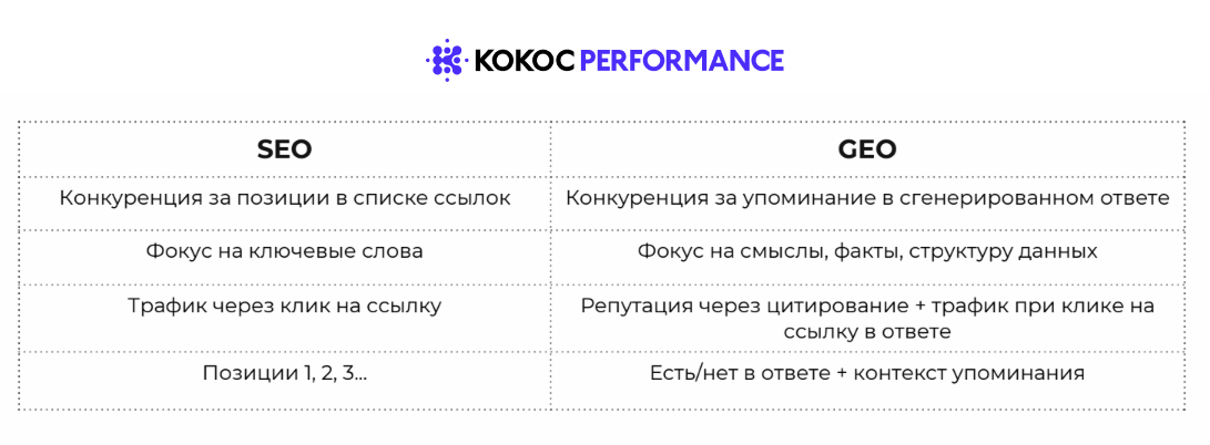 При этом GEO вовсе не заменяет SEO — заниматься надо и тем и другим. GEO, скорее, дополняет SEO, и благодаря этим направлениям бизнесы, компании, бренды развиваются во всех направлениях — и в поиске, и в нейросетях. И конечно, если не заниматься SEO и уповать на продвижение в соцсетях, ничего не получится. SEO — база, GEO — надстройка этой базы.