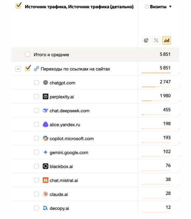 Тем не менее количество прямых переходов из генеративного ответа в нейросетях растет. Кроме прямого трафика, есть и косвенное влияние нейросетей на посещаемость сайта: пользователь видит ваше имя в нейроответе, а позже ищет вас отдельно в поисковике.