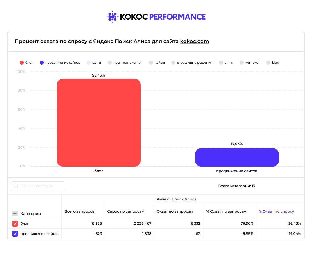 Приведем пример сайта Kokoc.com: в выдаче по 92% информационных запросов контент нашего сайта попадает в нейроответы «Алисы». Охват в коммерческих запросах ниже — 19%, для коммерческого кластера это очень хорошие охваты.