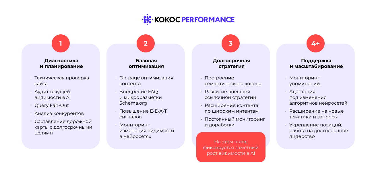 Действия по старинке. Еще один соблазн — копировать классический SEO, не понимая, что LLM-модели работают иначе, чем поисковые алгоритмы. Kokoc Performance работает на долгосрочный результат: помогает клиентам занять позицию эксперта, а не гнаться за разовым трафиком.