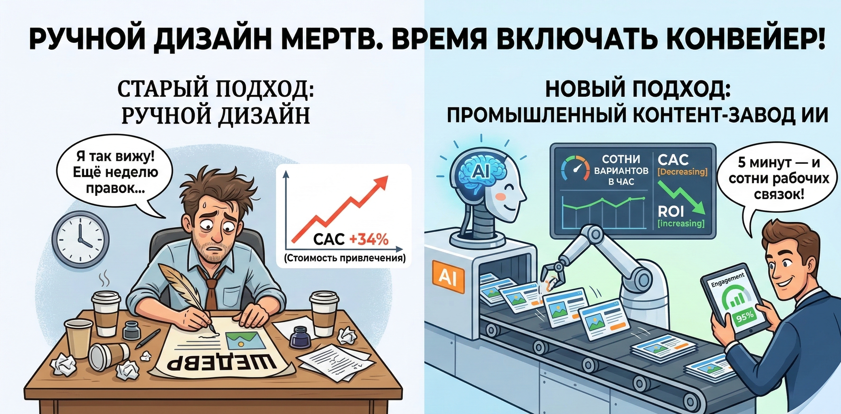 Ручной дизайн мертв. Пока ваш специалист неделю вылизывает пять баннеров, конкуренты скармливают нейросетям сотни вариантов в час. В 2026 году стоимость привлечения клиента (CAC) взлетела на 34%, и классический подход к тестам просто сжирает ваш ROI.