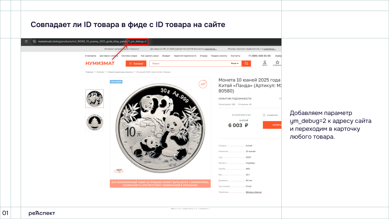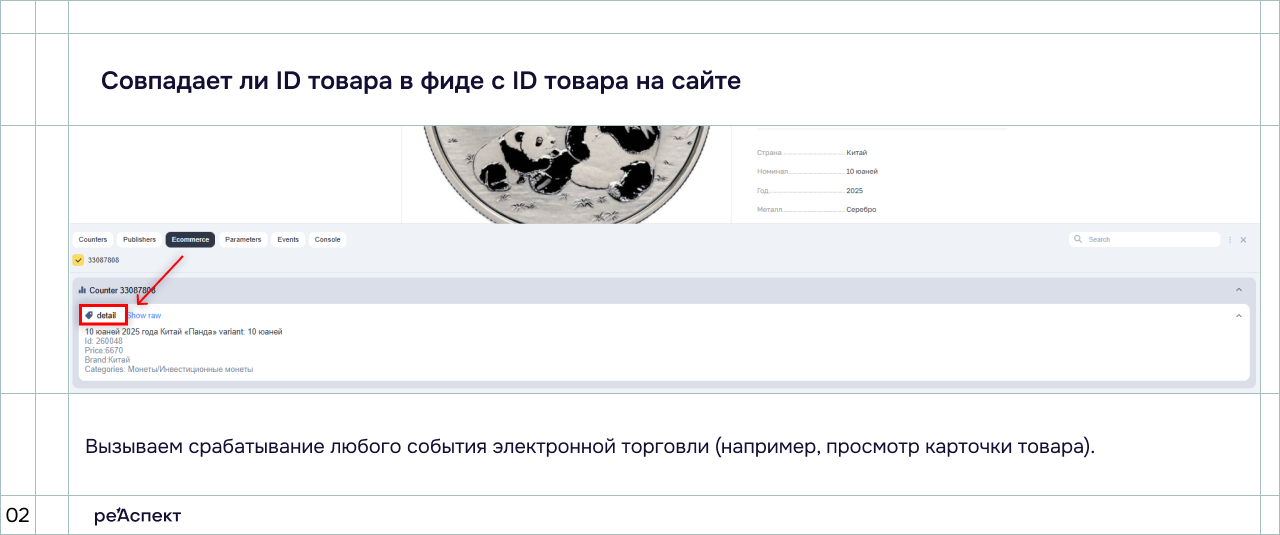 - offer id в фиде не совпадает с ID товара в Яндекс Метрике и/или АппМетрике.Проверка: добавьте к ссылке товара _ym_debug=2, откройте консоль браузера (Ctrl+Shift+J) и сравните значение ID в данных электронной коммерции с offer id в фиде.