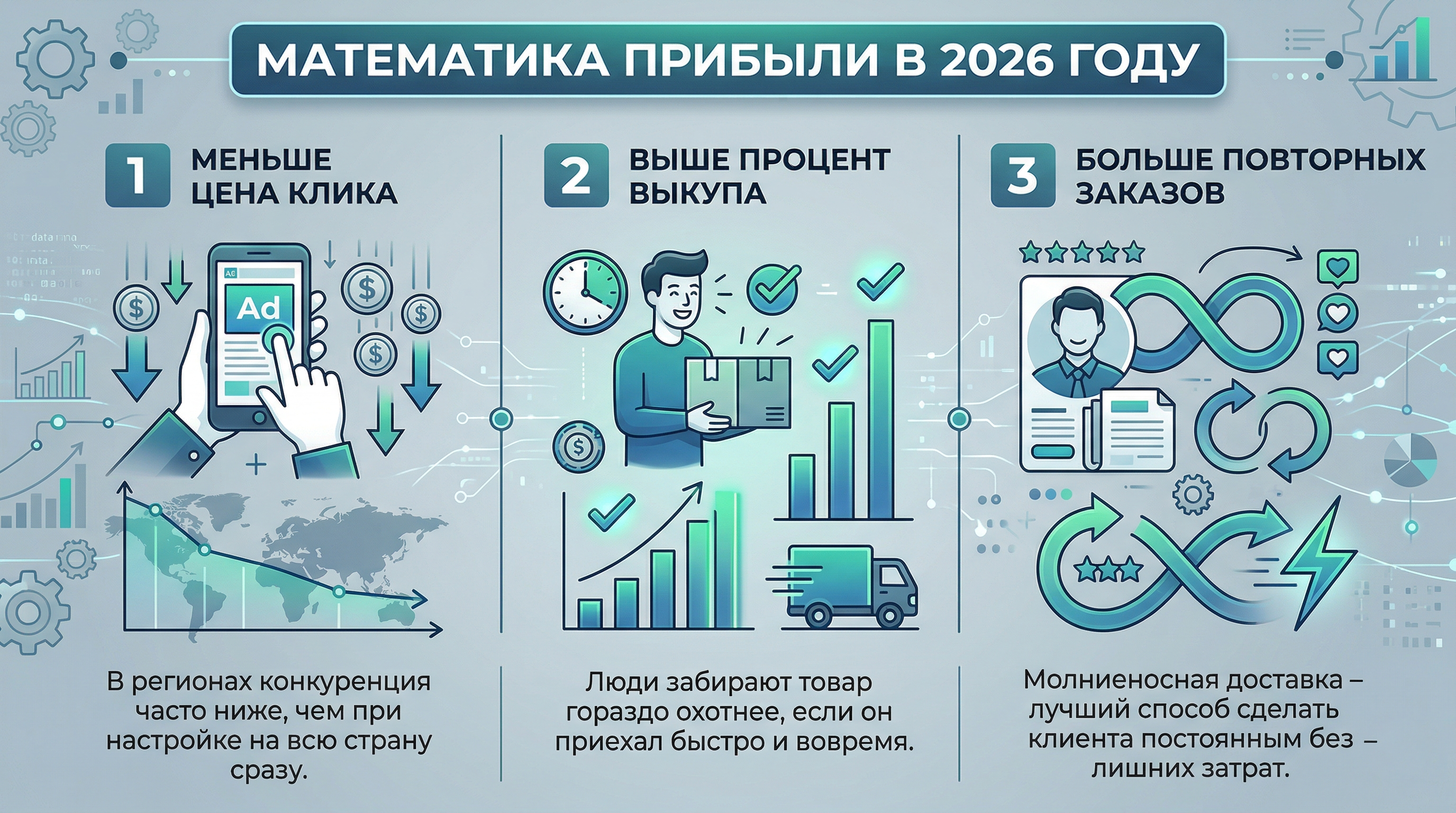 Переход на локальную рекламу снижает стоимость привлечения одного покупателя на 25% и увеличивает вашу чистую прибыль за счет резкого снижения затрат на логистику. Когда вы продаете товар в том же регионе, где он лежит на складе, вы не платите за лишние перевозки и получаете в три раза меньше возвратов.