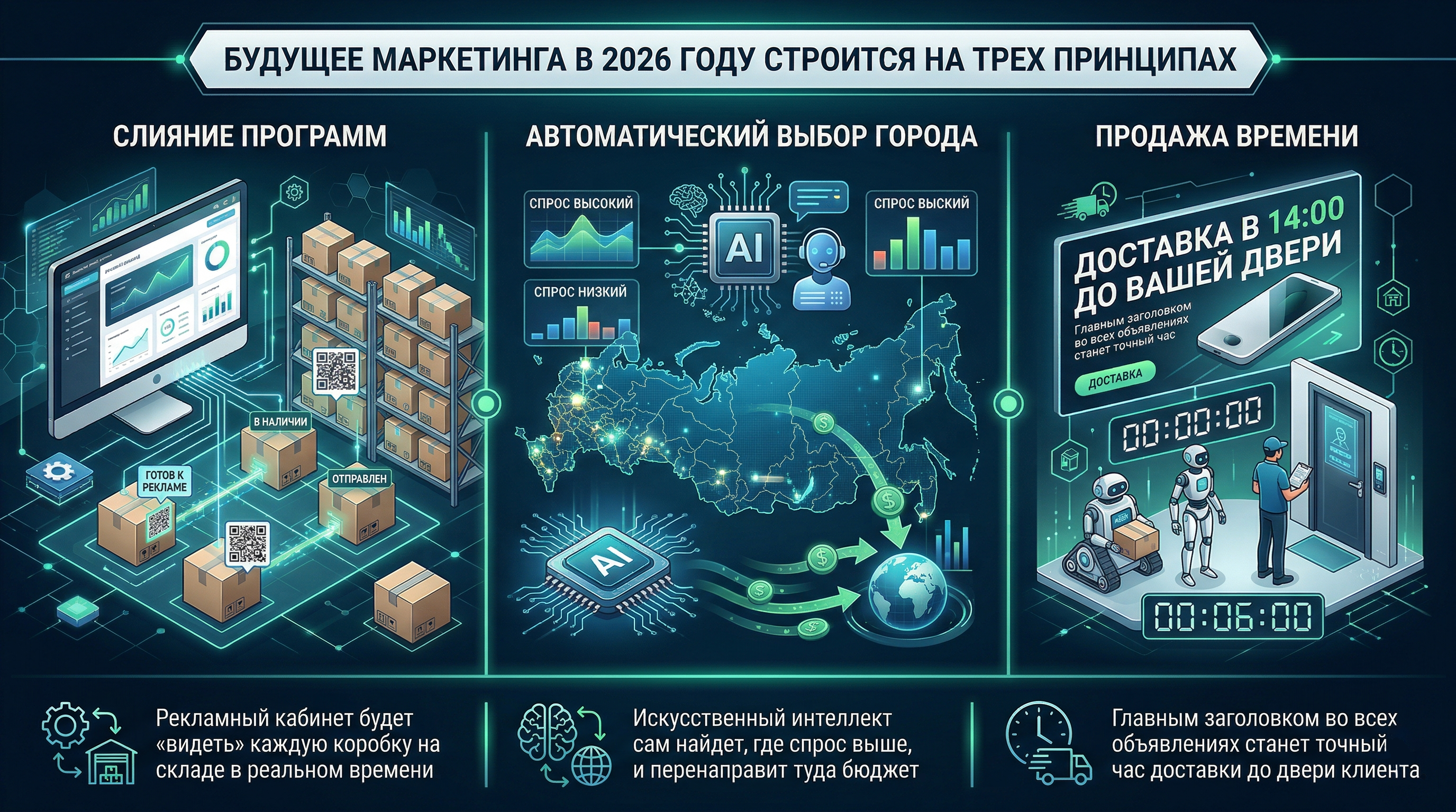 Если робот видит, что срок доставки до клиента вырос из-за пробок или перегрузки склада, он мгновенно корректирует рекламный посыл, чтобы не обманывать ожидания покупателя.