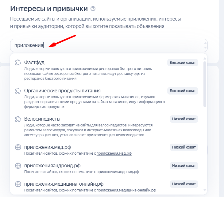 Как настроить в кампании: на этапе настройки группы объявлений перейти в раздел «Интересы и привычки». В поисковой строке можно указать: