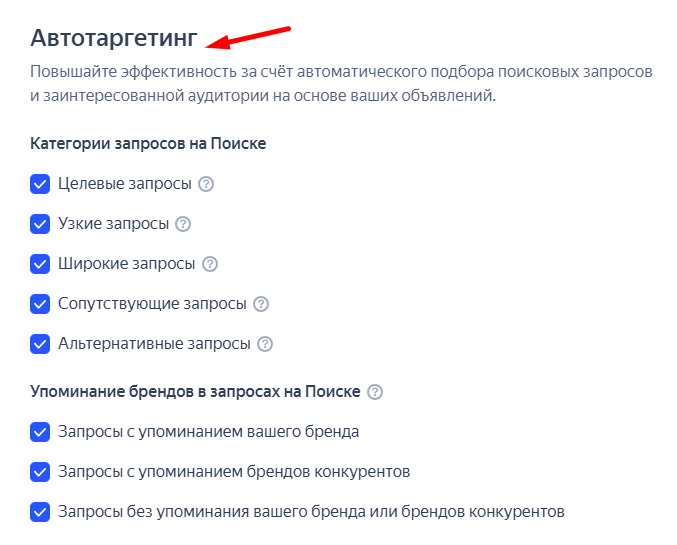 Как настроить: это обязательная опция, которую нельзя полностью отключить. Настраивается автотаргетинг на этапе работы с группами объявлений.