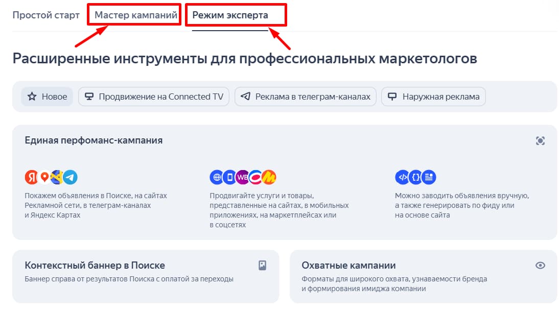 Технология создания нейрообъявлений доступна в «Простом старте», «Мастере кампаний» и «Режиме эксперта».