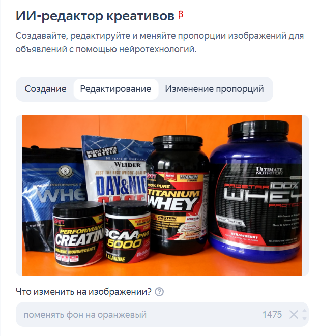 Например, нужно с помощью ИИ-редактора заменить фон в креативе на оранжевый. Ограничение — текстовое описание в промпте может быть до 1500 символов.