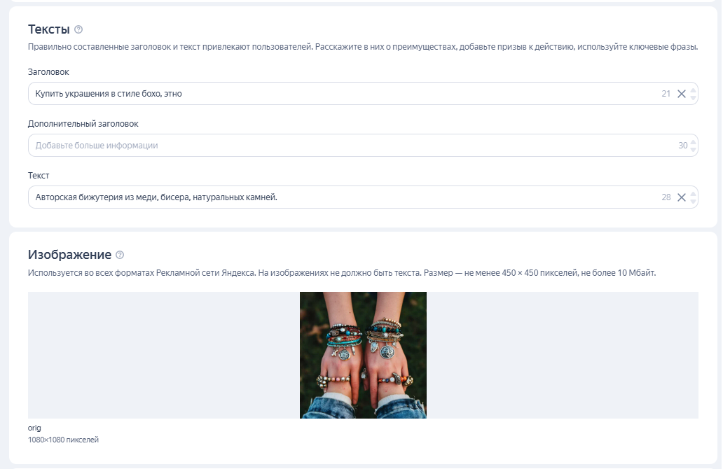 - Анализ текста объявления и посадочной страницы — нейросеть формирует представление о товарах или услугах.