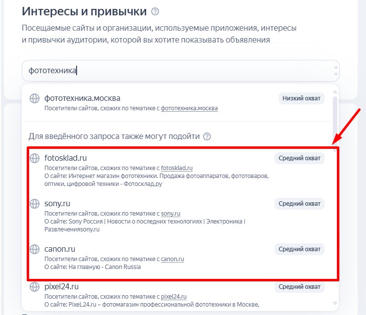 - Look-alike сайты. Алгоритм ищет похожие по тематике сайты, на которых может находиться ЦА. Таргетинг на конкурентные ресурсы с высоким и средним охватом позволяет привести на сайт теплых покупателей.