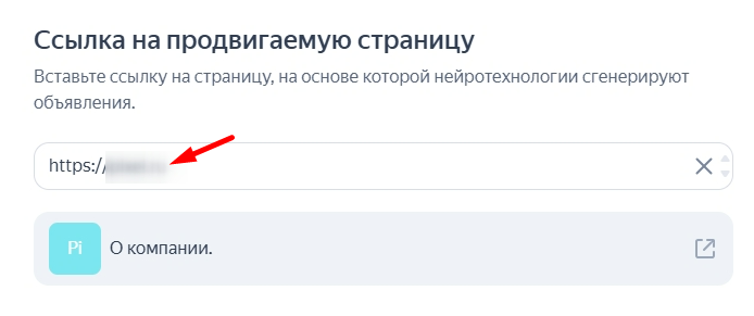 - Анализ посадочной страницы. Умный алгоритм сканирует URL сайта и берет оттуда важную для генерации объявления информацию, в том числе название компании, товары или услуги, преимущества (УТП), актуальные цены и т. д.