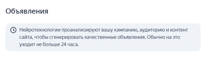 На генерацию объявлений может уйти до 24 часов. Это время ИИ анализирует кампании, аудитории и контент сайта для составления релевантных объявлений. Всего нейротехнологии могут сгенерировать до 25 объявлений.