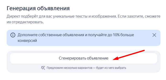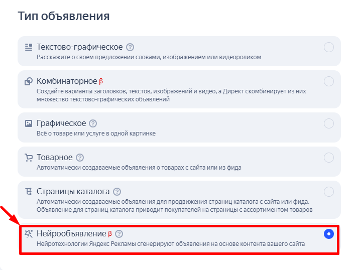 Для настройки нужно в пункте «Тип объявления» выбрать «Нейрообъявления». После чего ИИ сам сгенерирует объявления, опираясь на целевую страницу.