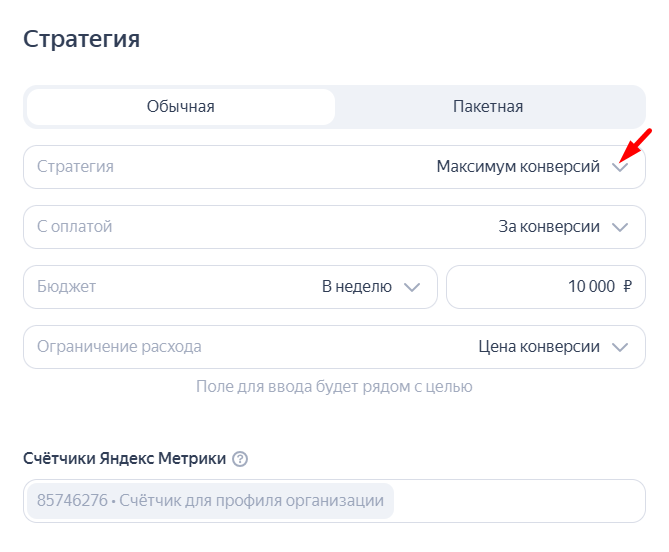 Для настройки автостратегии «Максимум конверсий» нужно указать бюджет и цель. При этом доступно два варианта оплаты: