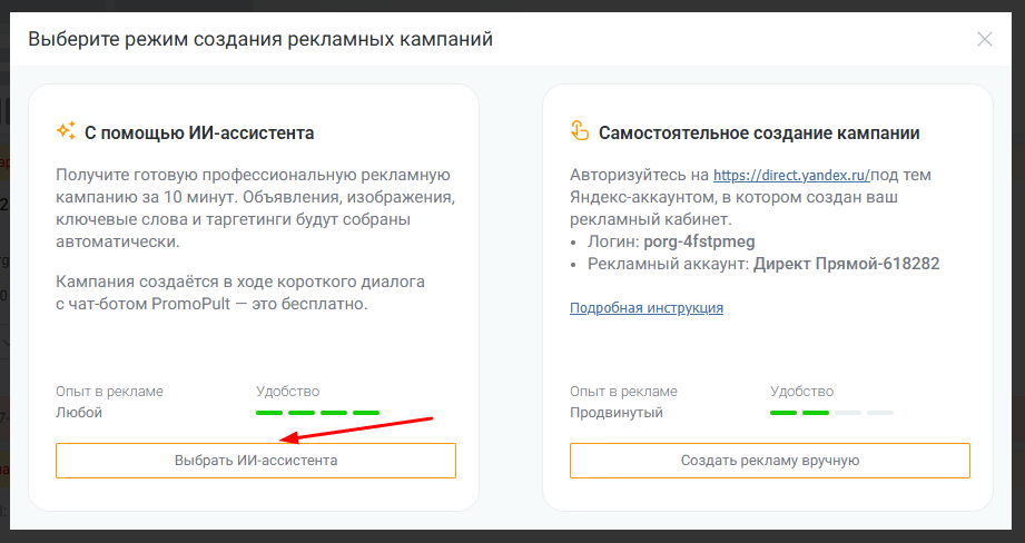 ИИ-маркетолог бесплатно доступен всем пользователям PromoPult. Это AI-ассистент, который в режиме диалога настраивает кампанию и загружает ее в прямой аккаунт Яндекс Директа.