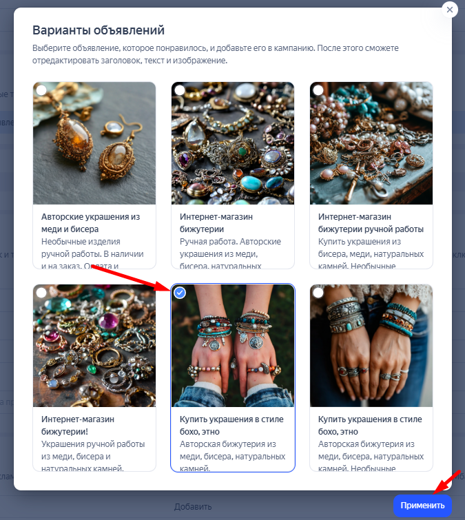 - Генерация креативов. ИИ создает несколько уникальных картинок в разных стилях, которые подходят под формат РСЯ.
