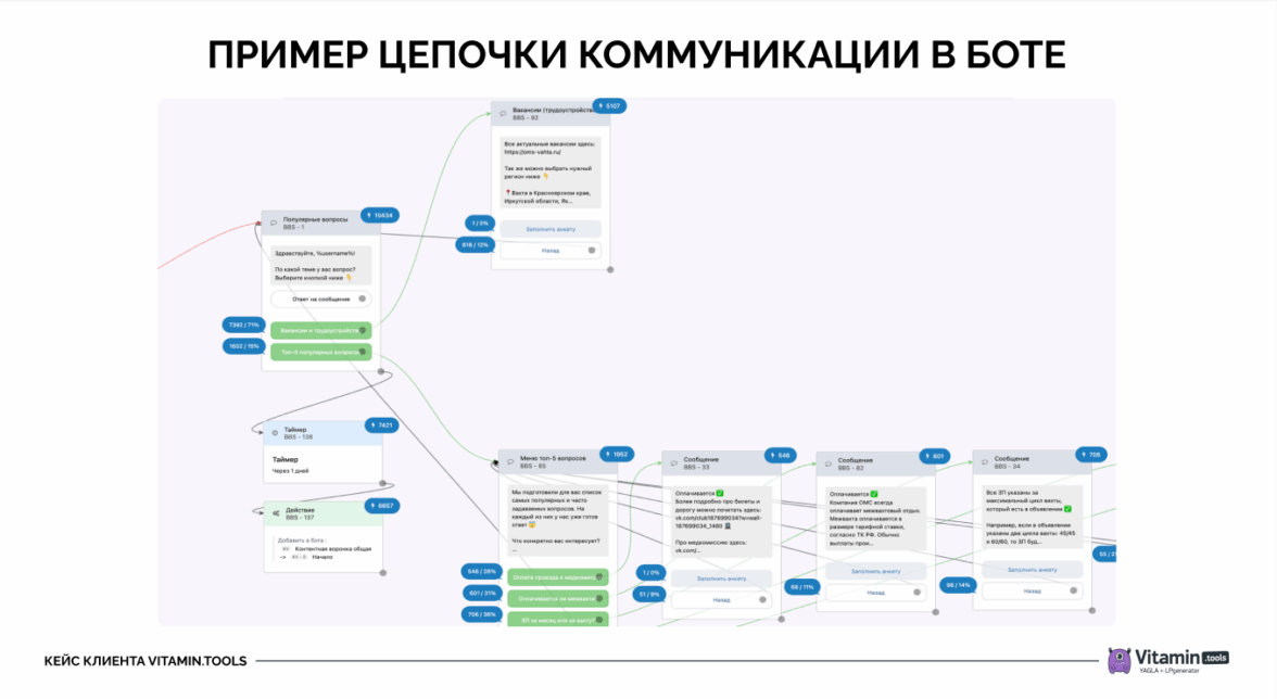 Часть процессов в проекте я автоматизировал. Настроил в ВК связку чат-бот + рассылки, чтобы кандидаты не ждали пока с ними свяжется менеджер. При входе в бота они получали пошаговые инструкции, могли найти ответы на частые вопросы и узнать подробности о работе на объекте. По сути я сделал полноценную воронку продаж, которая работала без сбоев даже при большом потоке откликов.