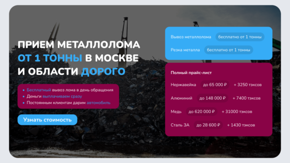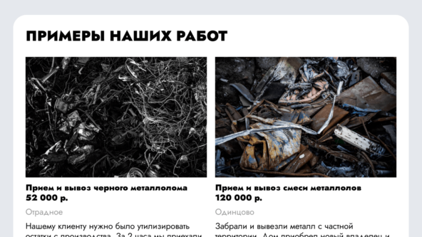 Добавили кейсы. Рассказали, как обычно работает компания: откуда и сколько металла может вывезти, по какой цене и сколько времени это занимает. Кейсы помогают клиентам убедиться, что компания реально существует и примерить на себя условия.