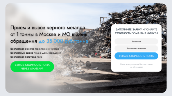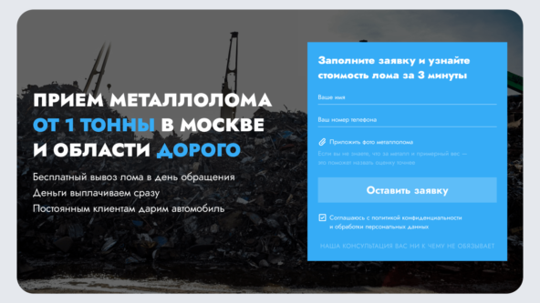 Человеку лень все это заполнять ради того, чтобы сдать металл, и он мог уйти на сайт тех конкурентов, где достаточно просто оставить номер телефона. Поэтому проработка удобной формы — первое, чем мы рекомендуем заняться.