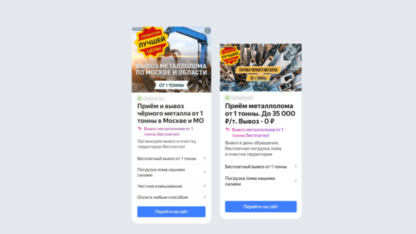 До работы с нами клиент уже пробовал рекламу на Авито и разные инструменты Яндекса: Карты, Директ, Бизнес, Услуги. Яндекс Карты работали лучше всего — когда люди ищут пункт приема, они обычно вводят в поиске район города. Например, «сдать металлолом Домодедово», «вывезти чермет Алтуфьево».