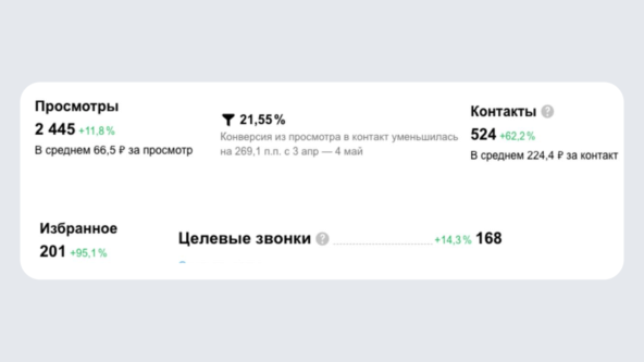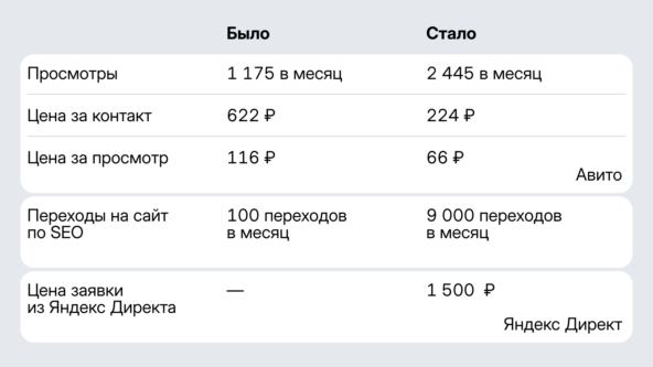 Вот результаты через полгода: объявления нашего клиента смотрело в два раза больше покупателей, а стоимость контакта мы снизили в 3 раза