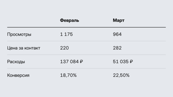 Бюджет, который нам выделил клиент в первый месяц работы с Авито, был в 2,5 раза меньше его обычных расходов на ведение аккаунта. Поэтому сначала продвижение не дало ожидаемых результатов: просмотров стало меньше. Но зато они стали более целевыми, и постепенно конверсия в заявку увеличивалась.
