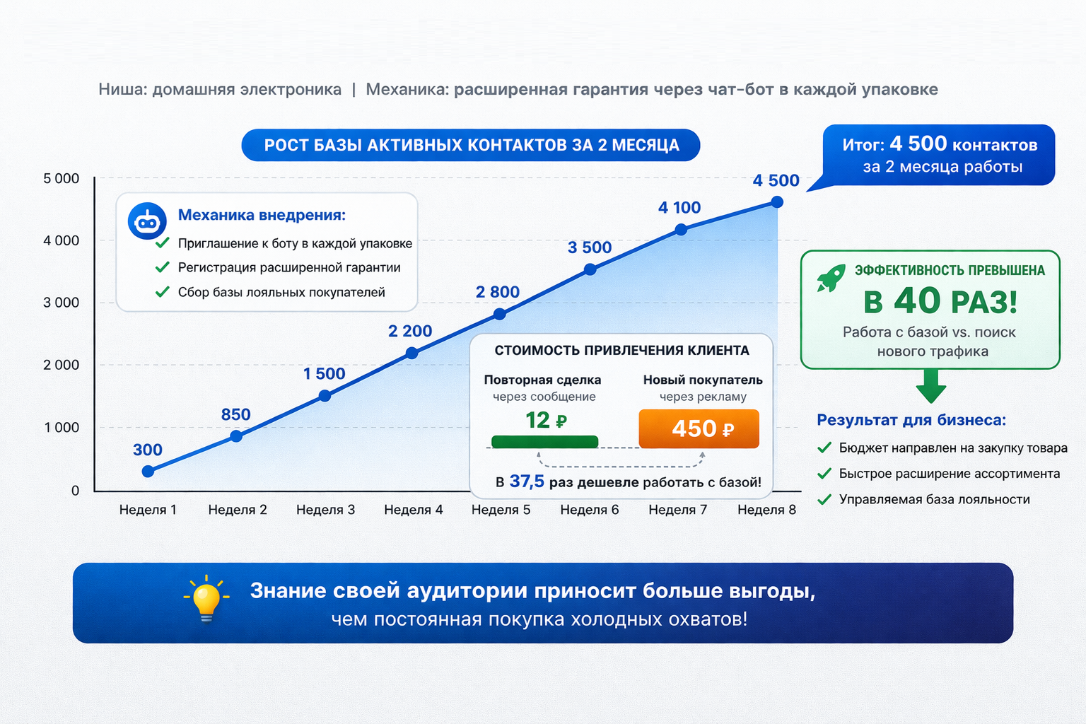 Рассмотрим реальные показатели внедрения системы на примере из практики в нише домашней электроники. Один из учеников перестал просто продавать товары и надеяться на случайные отзывы покупателей. Он вложил в каждую упаковку приглашение зарегистрировать расширенную гарантию через чат бот. Эта механика помогла превратить анонимные заказы в управляемую базу лояльности за короткий срок.