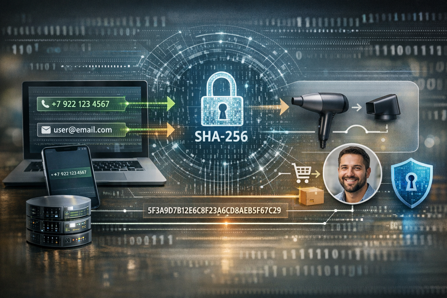 Безопасность процесса обеспечивает надежный метод хеширования по протоколу SHA-256. Этот алгоритм превращает номер телефона или адрес почты в уникальный буквенный шифр. Компьютер сравнивает эти коды и мгновенно находит соответствия в базе данных. Программа понимает: один и тот же человек купил фен на маркетплейсе, а через месяц заказал сменную насадку на вашем сайте. Вы связываете разные действия в единый и понятный профиль покупателя.
