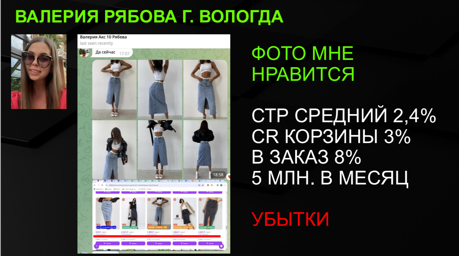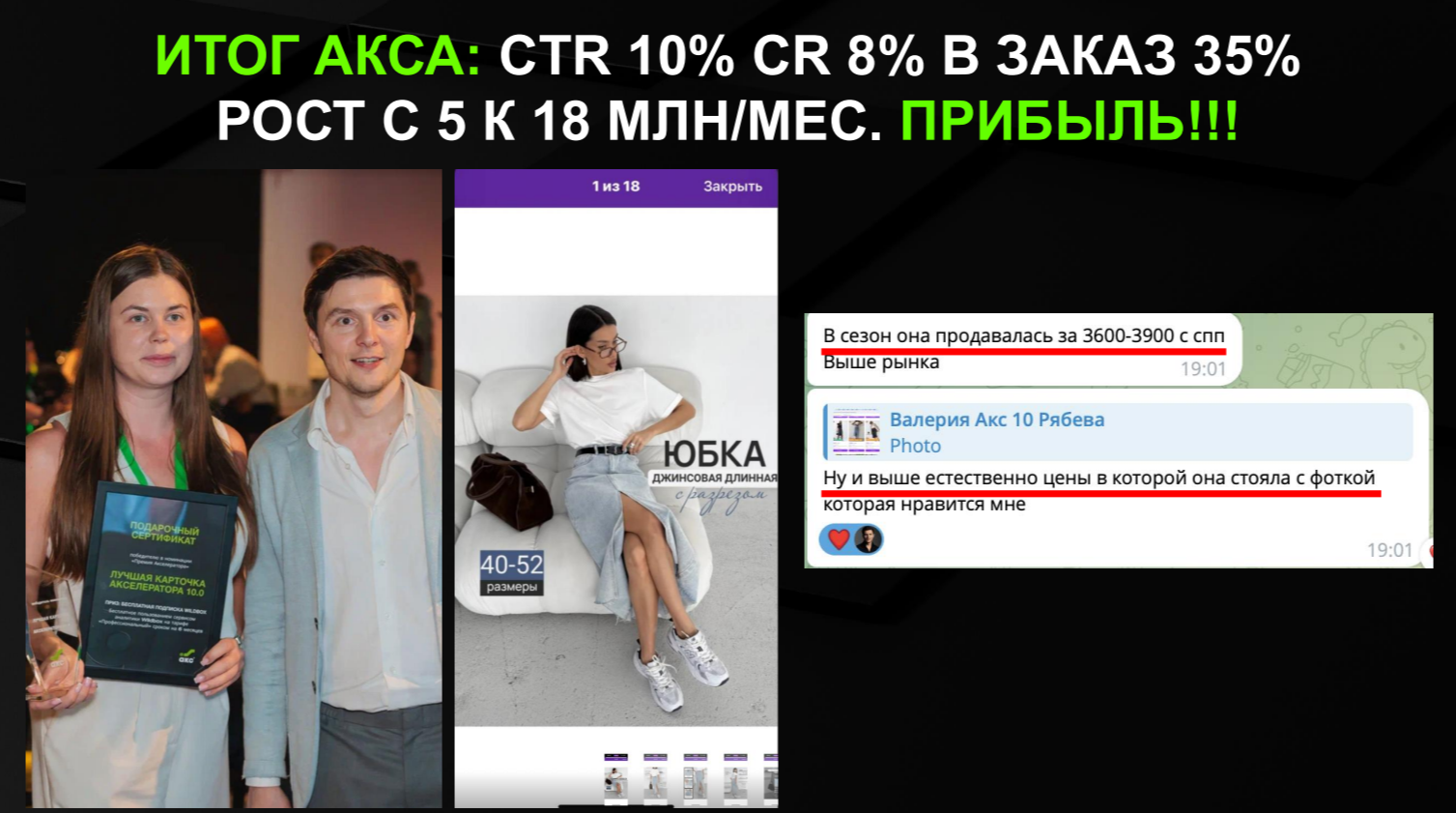 Только после получения этих цифр, новая «упаковка» была внедрена как основная. Через 3 месяца системной работы (включая управление внешним трафиком) бизнес стал стабильно прибыльным, а селлер смог поднять цену на юбку до 3600-3900 рублей, выйдя из ценовой конкуренции.
