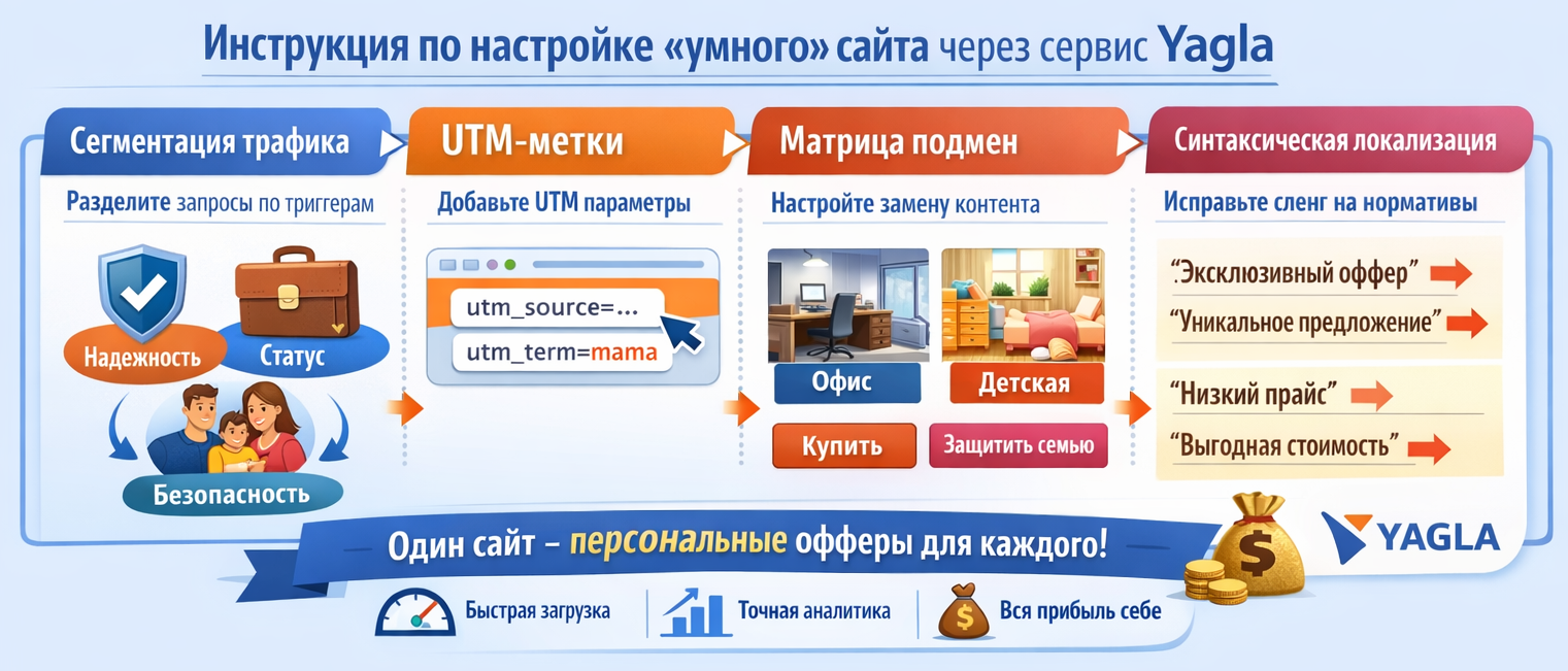 - Техническая связка через UTM-метки. Каждое ваше объявление должно содержать специальный «хвостик» – UTM-метку (например, utm_content=mama или utm_term=office). Именно этот код служит сигналом для сайта. Когда человек кликает по ссылке, Yagla считывает метку и понимает, какой именно сценарий подмены нужно запустить прямо сейчас.