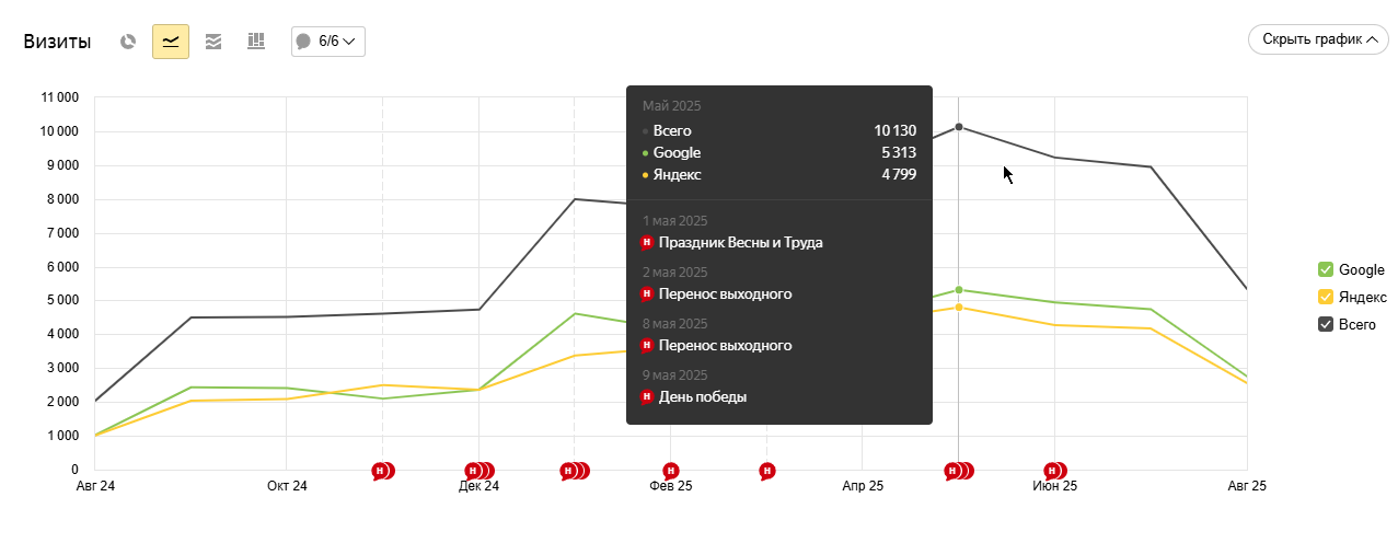 Проект показал, что даже при ограниченном бюджете и жёсткой конкуренции можно занять лидирующие позиции, если действовать системно: чистая техника + глубокий контент + планомерный линкбилдинг = предсказуемый результат.