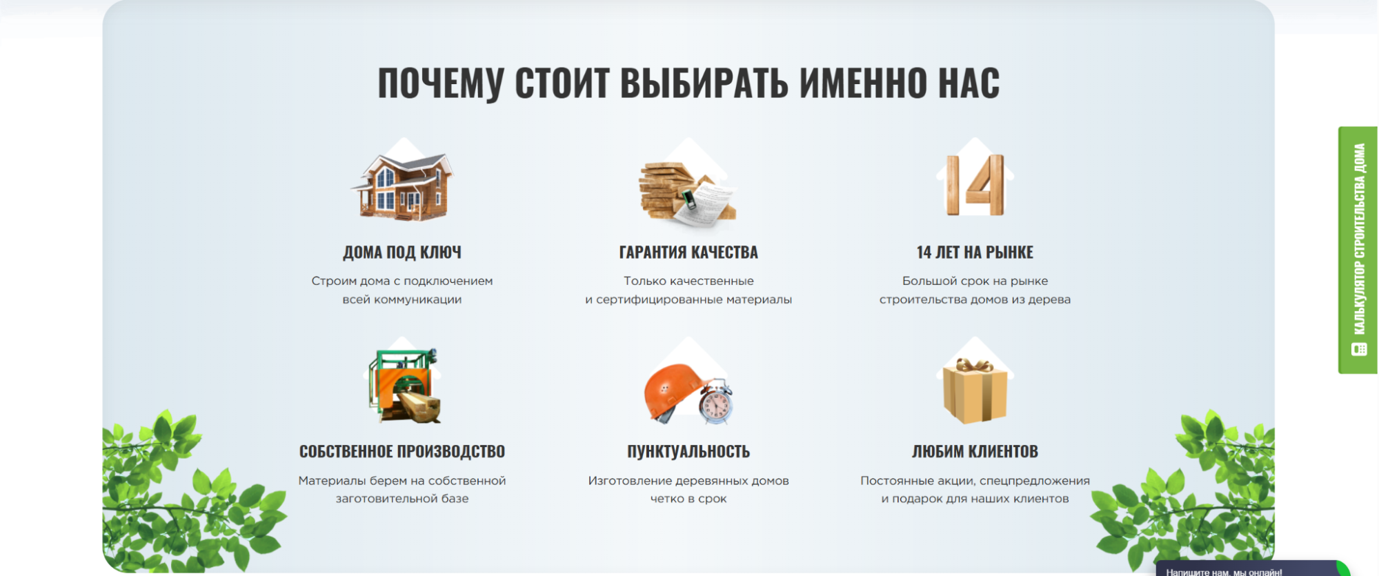 - добавили доказательства — количество построенных домов, гарантию, фото, сертификаты