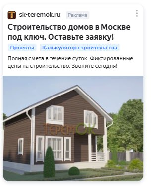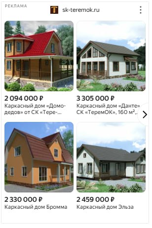 Это позволило показывать пользователю не просто текст, а объявление с карточкой проекта, фото, ценой и параметрами дома — что заметно увеличило CTR и качество переходов.