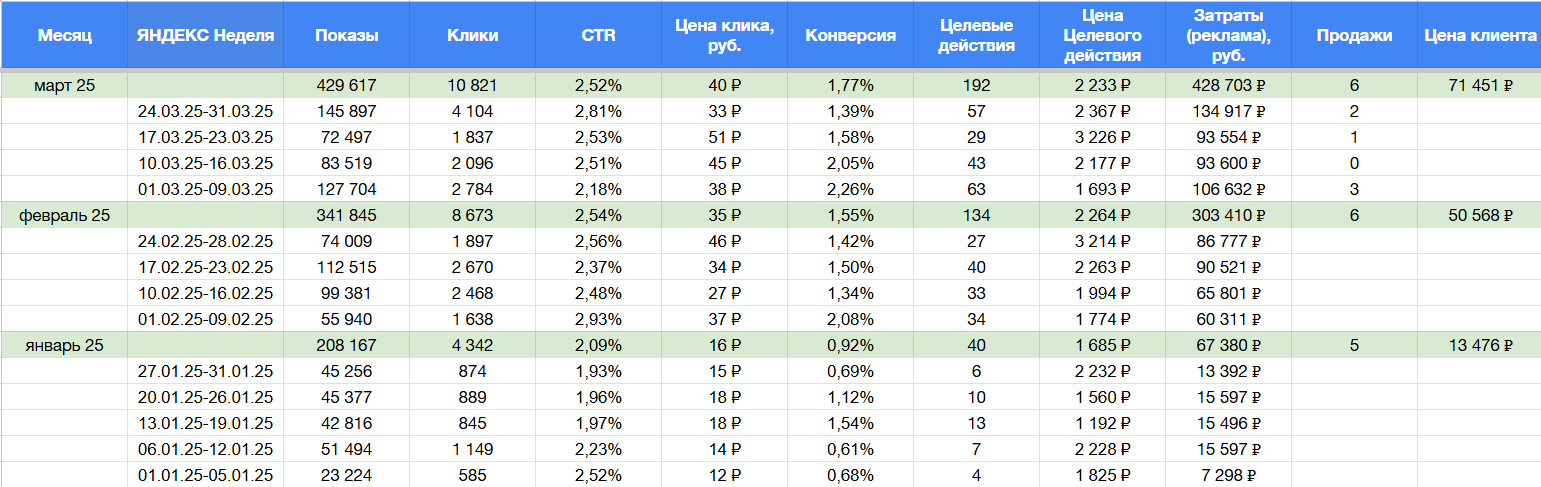 В сезон (весна–лето) усиливали поисковые кампании и повышали ставки на высококонверсионные запросы.А в зимний период, когда конкуренты массово выключали рекламу, мы не останавливали показы, а просто снижали бюджеты и удерживали видимость.