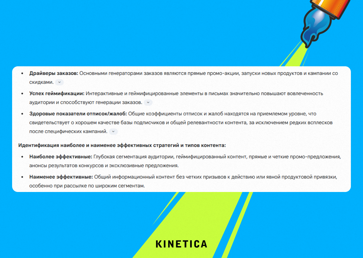 С этого момента мы перестали генерировать контент в лоб. Вместо этого AI стал нашим data scientist'ом, который препарирует каждую рассылку и говорит: «Смотри, вот здесь ты облажался, а вот здесь — попал в точку».