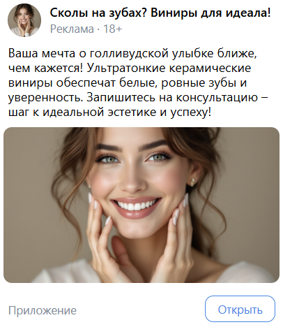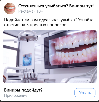 Лучше всего сработали такие объявления:“Стесняешься улыбаться? Виниры помогут! Узнай за 5 простых вопросов, подойдут ли они именно тебе”.