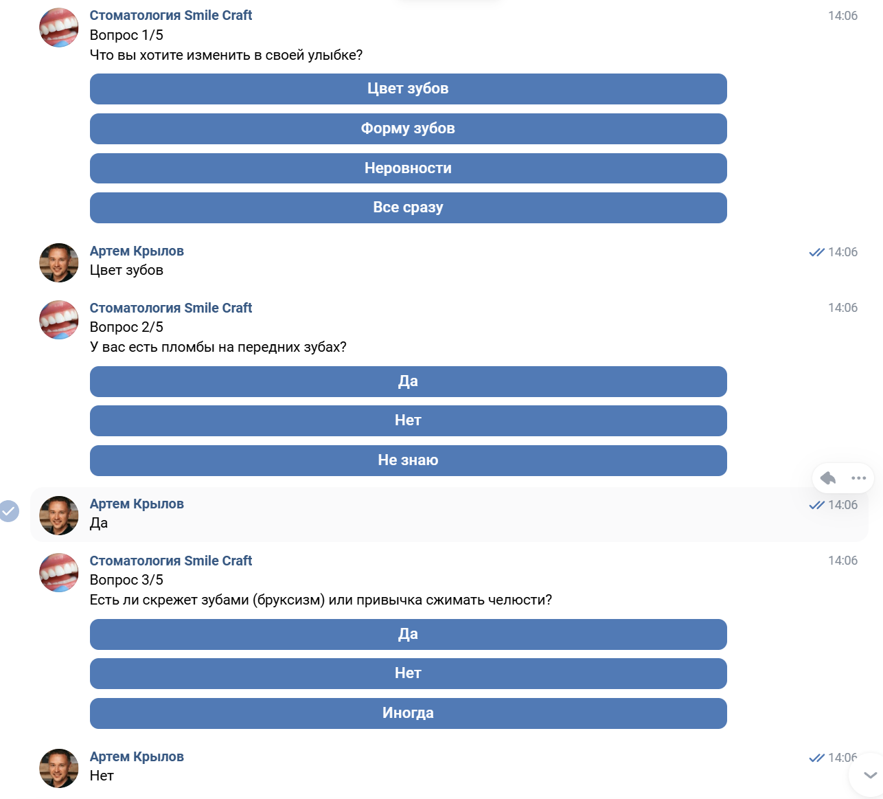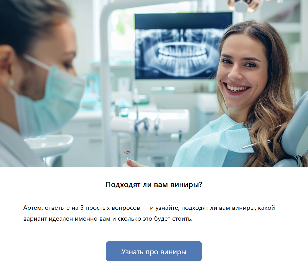 Почему? Потому что мы говорим на языке клиента. Человек уже ищет “виниры” во ВКонтакте или гуглит стоматологию, он сомневается, думает. И тут попадает на наш квиз — идеальное попадание в его потребность.
