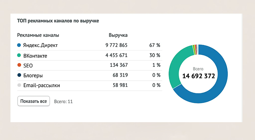 Наиболее популярное решение на рынке — это Roistat, его стоимость начинается от 5 900 ₽ в месяц, однако можно настроить передачу оффлайн-конверсий и доходов из CRM-системы в систему аналитики — Яндекс Метрику бесплатно.