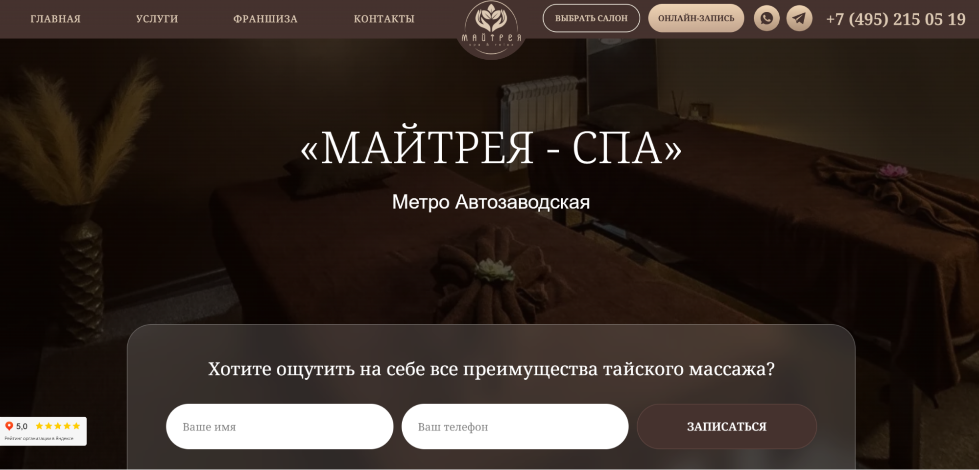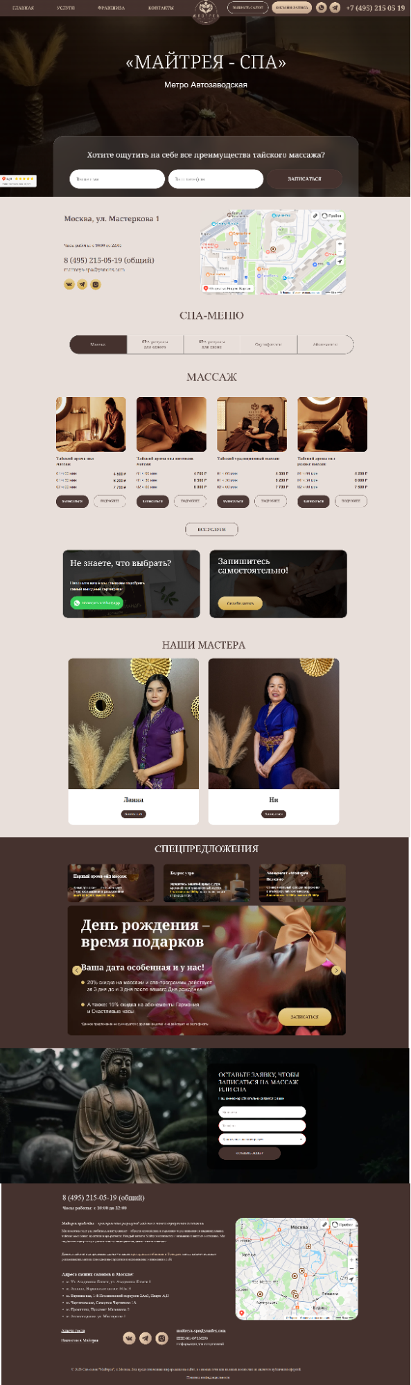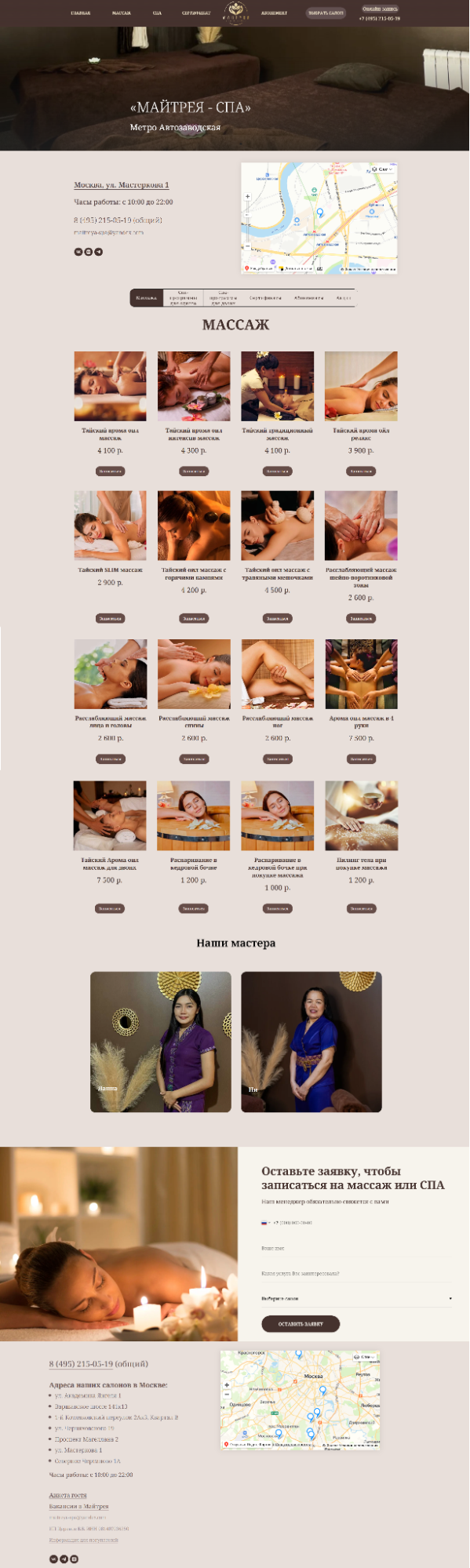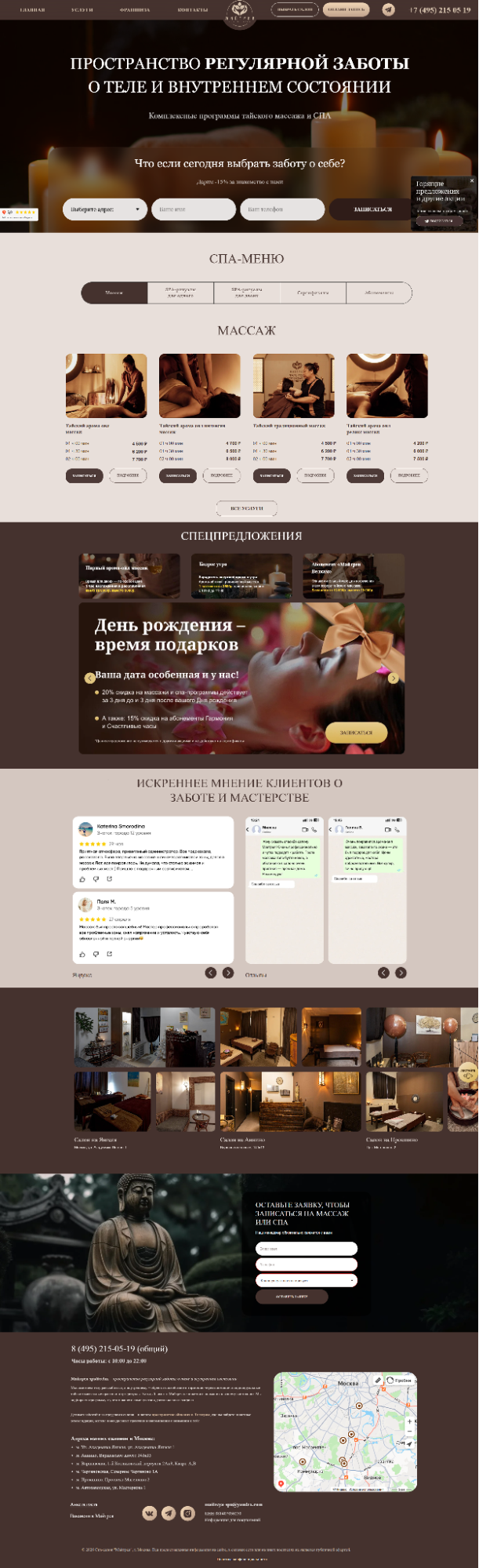 К нам обратилась сеть салонов тайского массажа в Москве. 8 филиалов, сертифицированные мастера из Таиланда, полный спектр услуг.