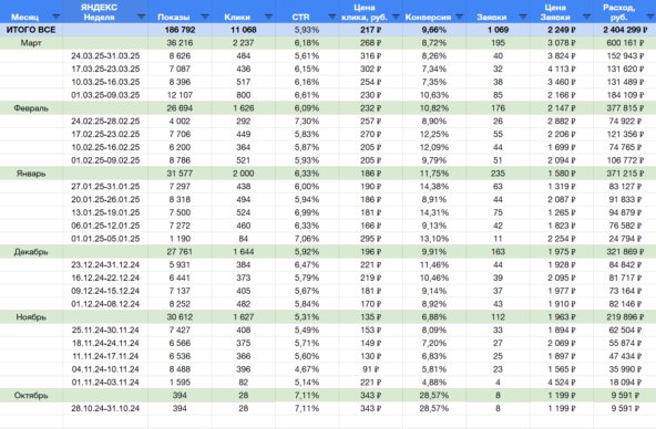 Клиент взял паузу на раздумья и вернулся к нам спустя полгода — в сентябре 2024 года, но уже с более осознанным подходом: он решил запустить комплексную работу, включающую контекстную рекламу в Яндекс.Директ и доработку сайта.